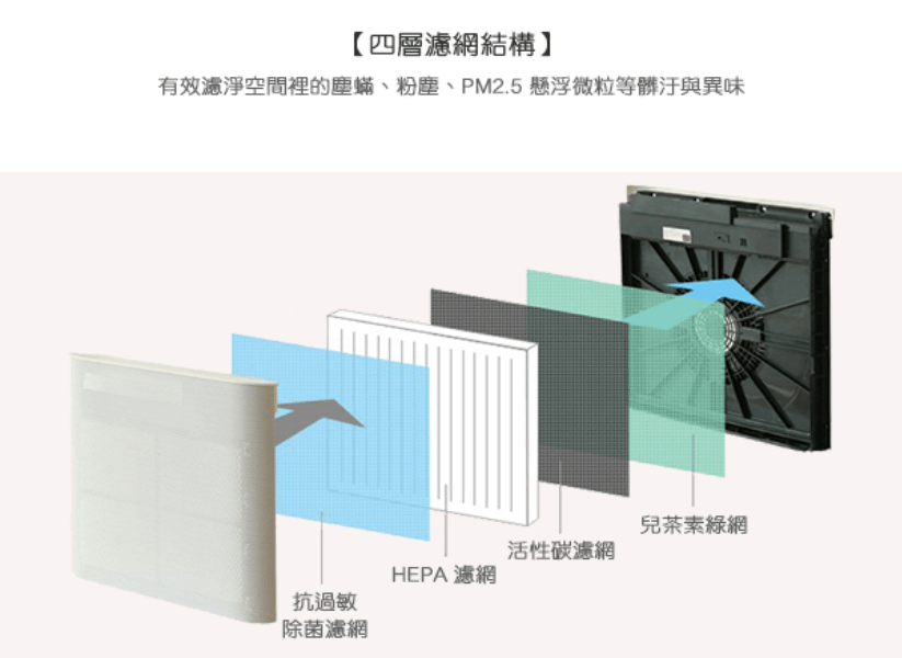 除了能自動偵測周遭空氣品質,還有四層濾網結構的多層防護,有效濾淨空氣中的粉塵與懸浮微粒噢!